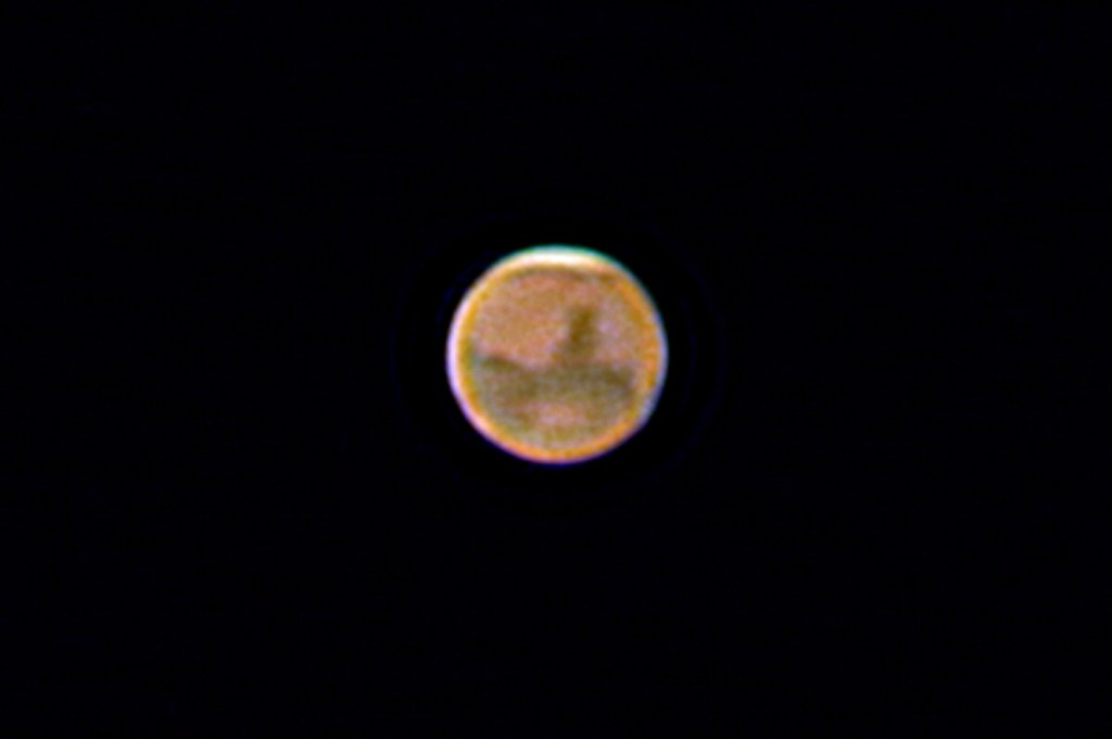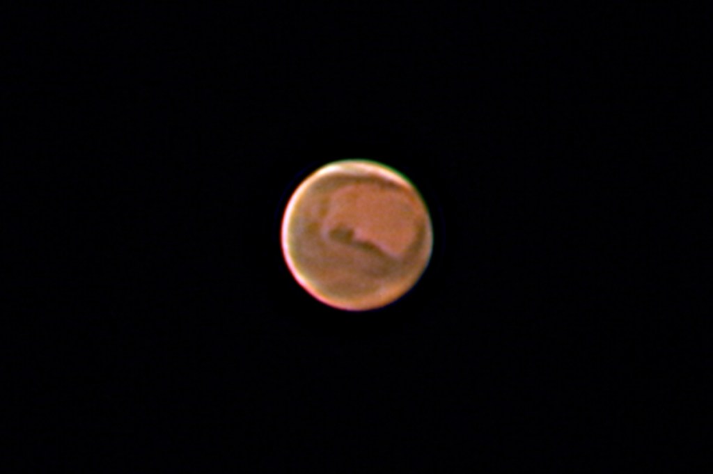Mars is now slowly falling behind Earth in its orbit, increasing the distance between us. This may be the best image I may get this opposition with the weather deteriorating. It is a stack of 6748 images, taken through a 10″ Newtonian reflector (f4.7), using a Canon 60D. Each frame was 1/640 of a second at ISO 1000. The North Polar Cap is visible at the top with Syrtis Major on the far right. Image was taken Nov. 15th. Next image is the best I could capture with an 8 inch Newtonian (f6). It is a stack of 3341 images, 1/500 at ISO 1000. Syrtis Major has rotated more towards the center of the disc. The atmosphere was not as clear and steady as Nov. 25th and needed to be over processed to get detail.