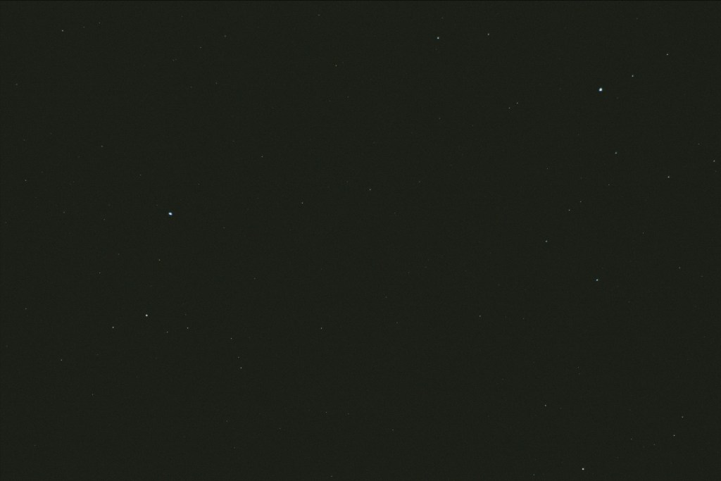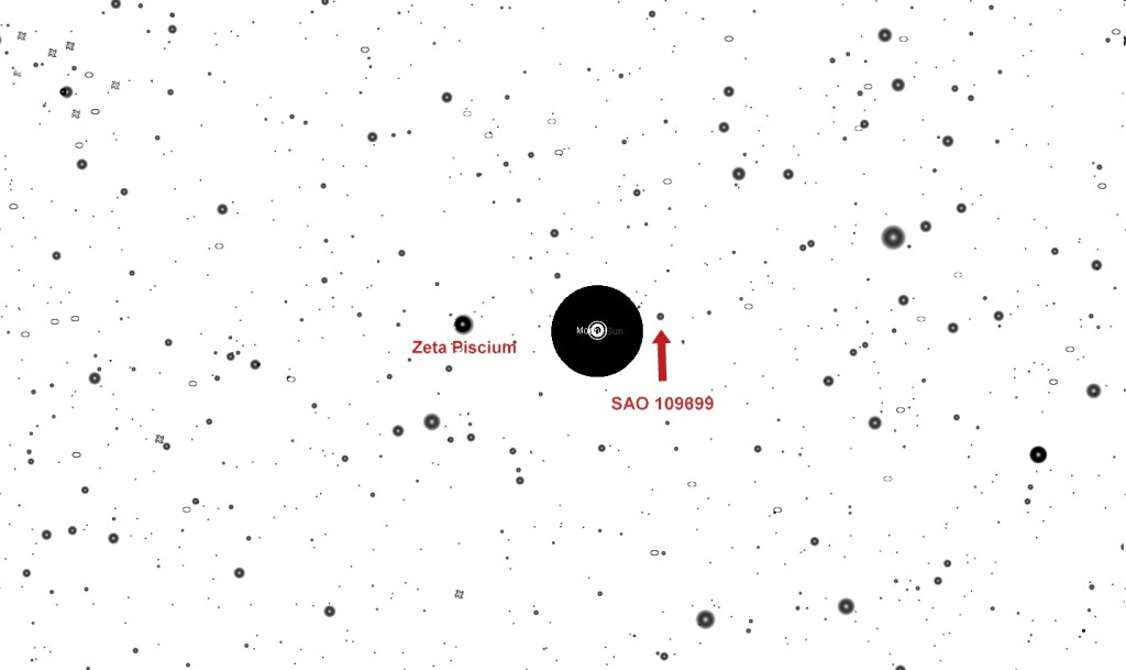 This is a view of the starfield without the Sun and Moon. ISO was 400, focal length 300mm, exposure 1 second at f5.6. The dim star just above center is SAO 109699, Zeta Piscium is the bright star to the left.