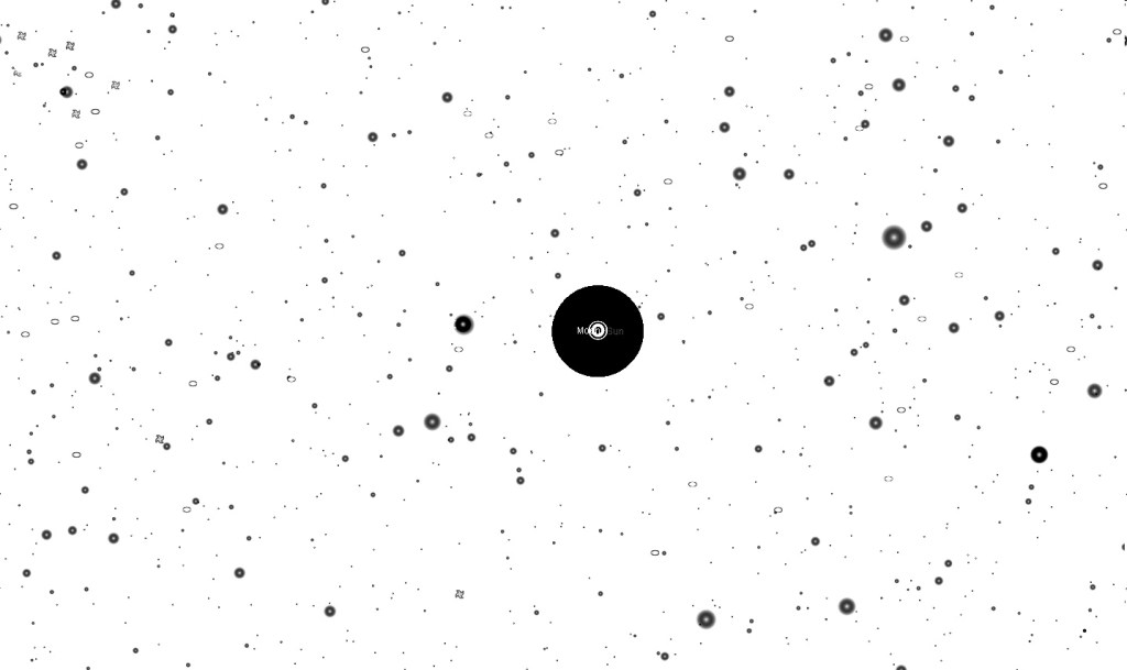 “d” is going to be the distance from the Sun’s center to the line as it passes the Sun. Now I need to know what star will be my target. This image from the planetarium program “The Sky Professional X” shows the area around the eclipse as seen from southern Texas.