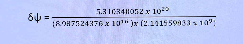 The brightest star to the left of the image of the Moon is Zeta Piscium. After calculating its angular distance I found it is about .824 degrees from the center of the image of the Moon (which is covering the image of the Sun). I may be off by an arc minute but close enough for our purposes. I calculated that the angle at our distance would translate to 2.141559833 x 10^9 meters and that will be our “d.” There is no need to be so exact but it adds difficulty (and looks cool).