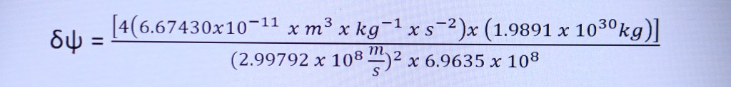 But wait! Is my math correct? It took awhile to find what the details of Eddington’s expedition in 1919 was. They calculated that if the star was right at the Sun’s limb, the angle of deflection would be 1.75 arc seconds. I then figured what “d” would be at that time. ”d” is now 6.9635 x 10^8 meters. Here are my results: