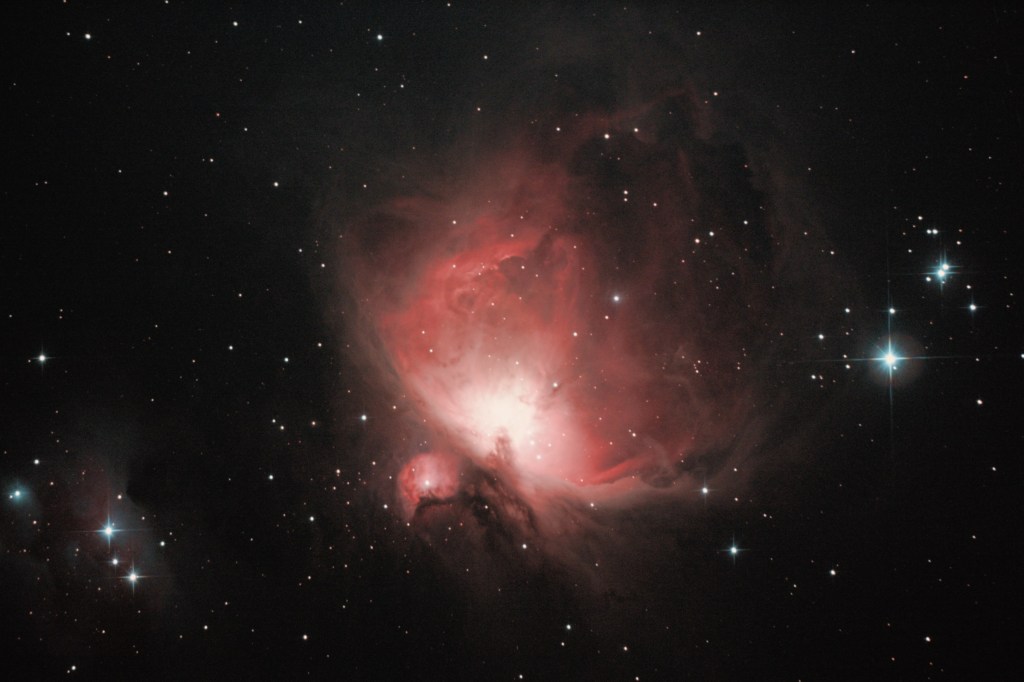 80 mm refractor. Stack of 85 images. 60 second exposures at ISO 2500. Diffraction spikes created with a homemade adapter.