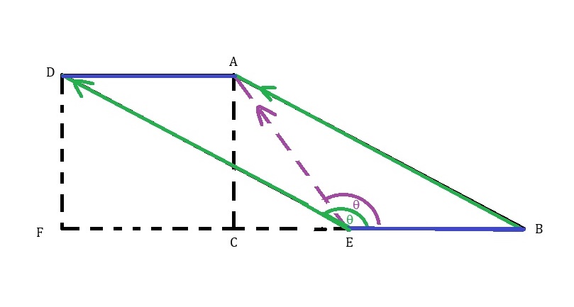 We will apply our equations to the diagram above. Line BE is the velocity of the rotation. Line BA is the new motion which could be a throw, a jump or a stride. The blue theta is the angle away from the rotation at the instant of the change in direction (usually designated as D). The purple theta will be the new angle after the forces average out.