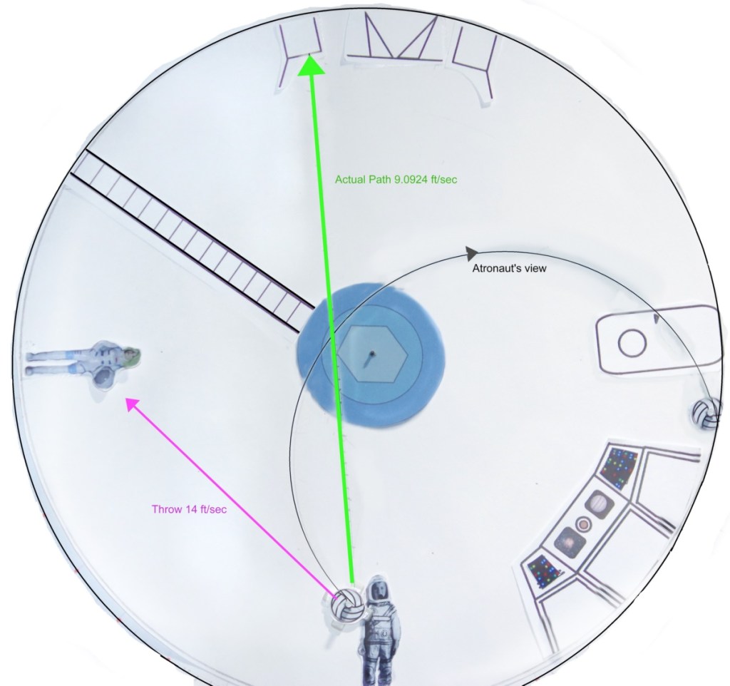 The video I am working on will feature the view below (life issues have kept me from finishing the video but I am close). The Purple arrow is the direction and velocity of the original throw. The green arrow is the actual throw after the change in vector from the rotation. The black arrow is how it will look to the astronauts, demonstrating the Coriolis Effect. With a slower throw, our astronaut could catch his own throw.