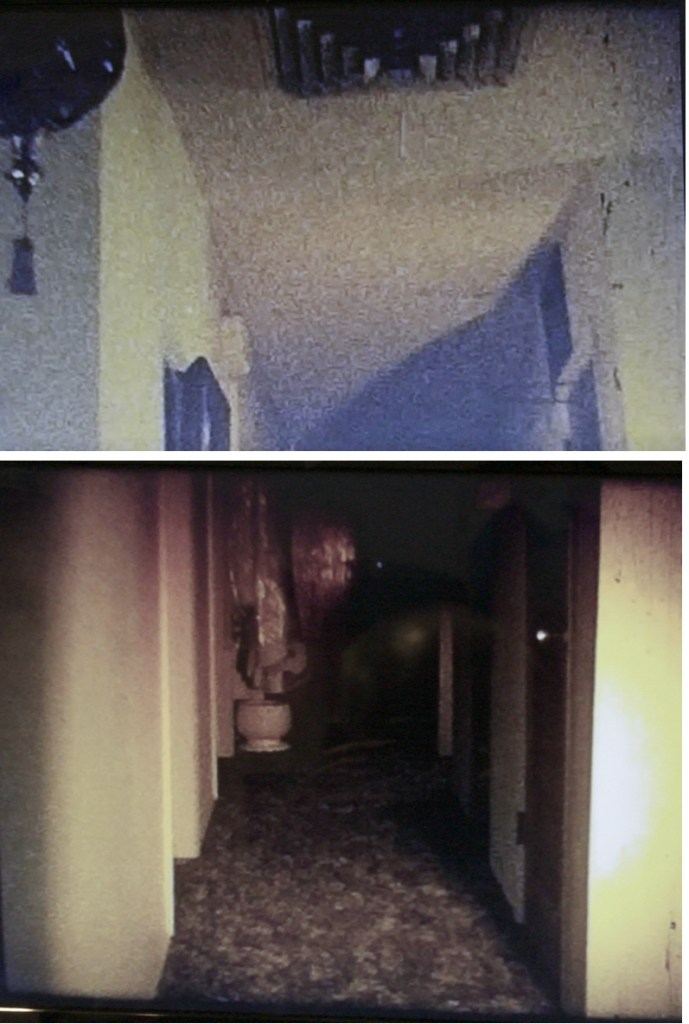Recreation. Lasts only about one second from sense of movement to disappearance of shadow. Frame from one of my old movies. Same hallway but the hanging drapes and pot were gone by then (mom would hang drapes everywhere for her drapery business).