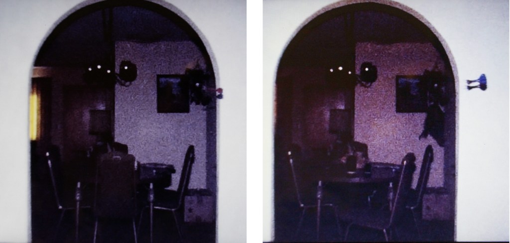 I walked through the dining room and as I was about even with the middle of the table I was looking at the floor about six feet in front of me and I saw something move in the living room. I looked up and saw a shadow dart behind the lamp straight in front of me. As I passed around the table I looked along the wall behind the lamp and saw what looked like a shadowy head dart back behind the lamp. I remember saying something like “nice try,” and kept walking towards the bathroom. After entering the bathroom and closing the door, I passed through a cold spot. Not like a draft but more like a bone chilling cold space (hard to describe). After I got as far as the sink, it was gone. I went back and stood in that cold spot (I can still feel it forty years later). While in it I heard what sounded like voices far off and no words were discernable. All I remember after that is telling Dad about it and then going home. He was angry with me for leaving him alone with the ghost. Too bad. Whether I used the bathroom or waited until I got home is not clear all these years later but I think I held it and left immediately. First, I have been trying to find photographs of that angle where you can see the living room and the lamp. I found it in an animation I made of the invisible man throwing darts. Basically, a frame at a time and lots of string. I also found a photobomb of my sister peeking around the corner in one frame (at least I hope it was her!). Here is that frame. It is only one frame in the sequence so in my movie goes by so fast you hardly notice it (I didn’t see it for over forty years! I only found it because I was looking for the photo angle!). Here it is. See her on the right side? Remember that image of someone looking from around something.